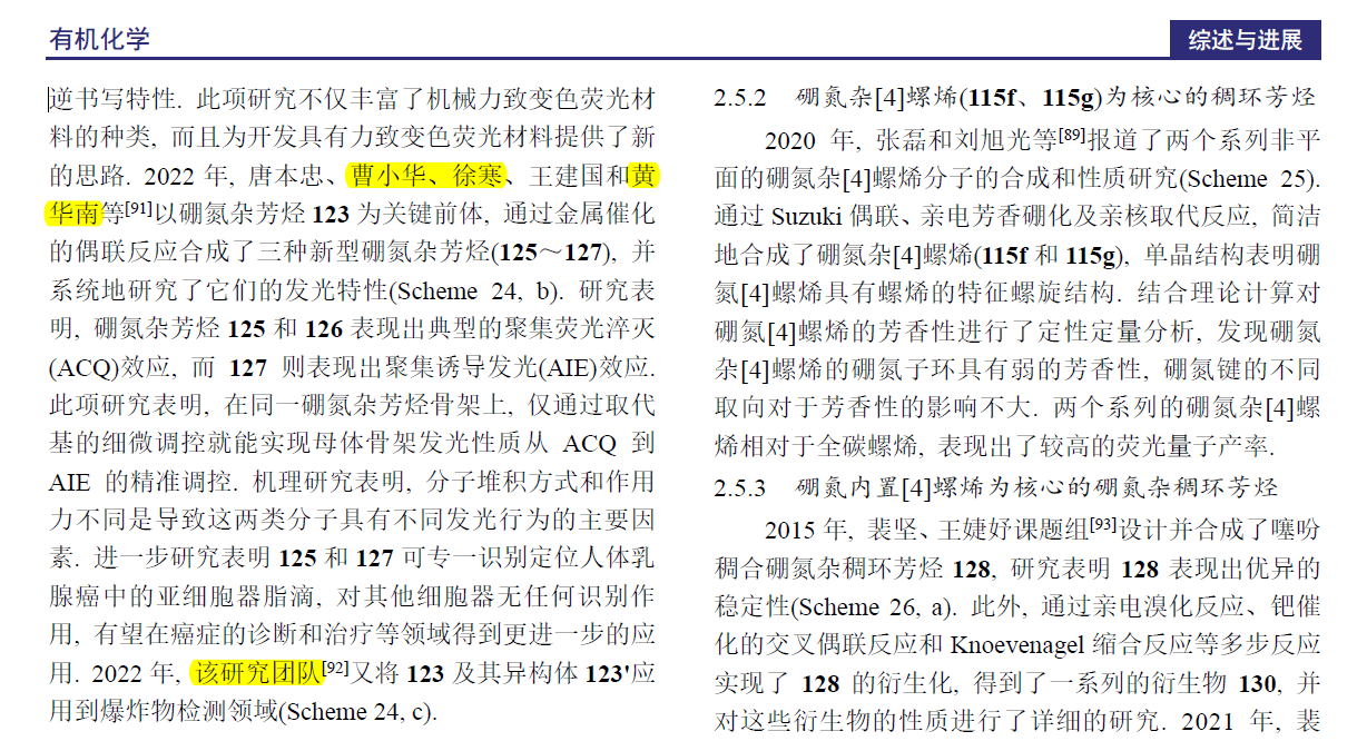化学化工学院有机智能材料创新团队自成立以来一直致力于含主族元素有机功能分子的构筑及应用研究。团队以利用最简单、最实用的方法构筑一些结构独特、性能优异的有机功能分子为宗旨,在拓展硼氮有机功能材料的种类和功能方面已取得了部分创新性研究成果。特别是通过将现代合成方法学与硼氮有机功能分子的构筑巧妙结合,构筑了一系性能出色的硼氮功能分子,解决了硼氮功能分子构筑方法单一,新性能开发难的难题。目前已实现智能材料在指纹识别、信息防伪、人体乳腺癌细胞器高清成像、炸药可视化检测、人体谷胱甘肽检测等方面的应用。相关研究成果已在Angew. Chem. Int. EdChem. SciAnal. Chem,Chem. Eng.J,J. Mater. Chem. AOrg. Chem. Front,Adv. Optical Mater,Dyes and Pigments等化学领域国际顶级及权威期刊发表。这些研究结果拓展了硼氮功能分子的研究边界,为认识硼氮功能分子新的性质和功能提供了新视角。