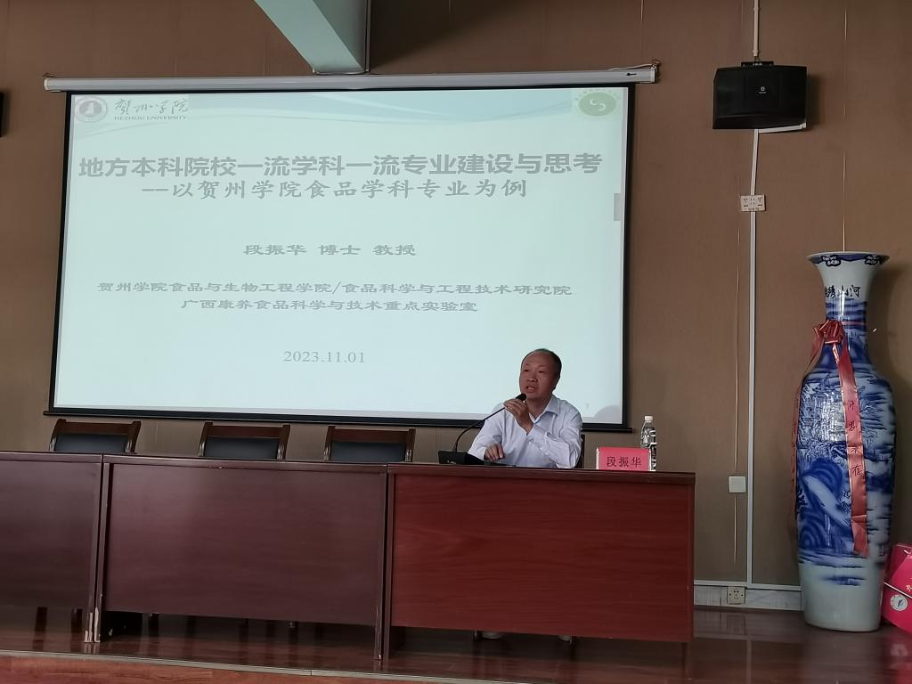 为了响应学校应用转型发展号召、加快推动药生学院学科、专业、课程应用转型发展速度,11月1日下午,药生学院邀请食品科学与工程国家级一流本科专业负责人、贺州学院食品与生物工程学院名誉院长段振华教授来校就学科、专业及课程建设进行交流。段教授作题为《地方本科院校一流学科一流专业建设与思考——以贺州学院食品学科专业为例》的报告。