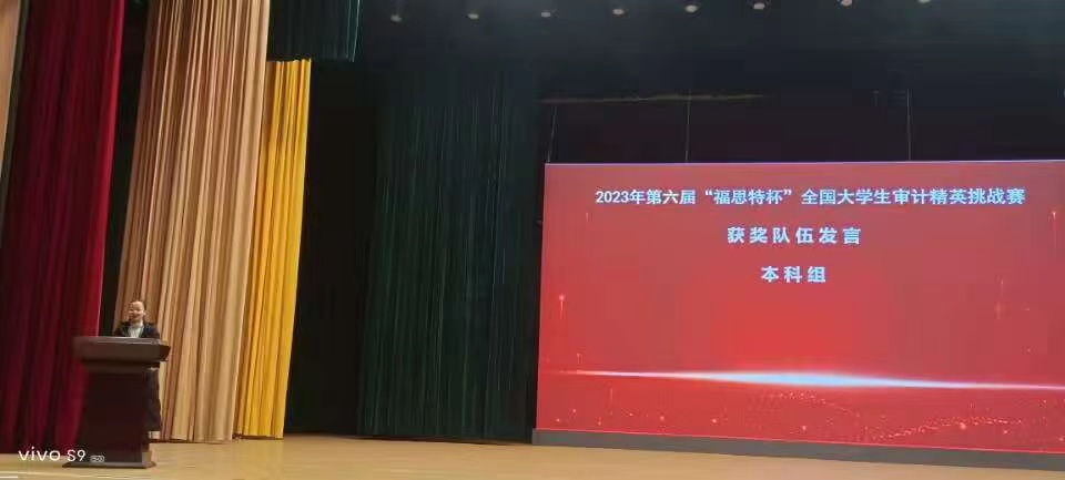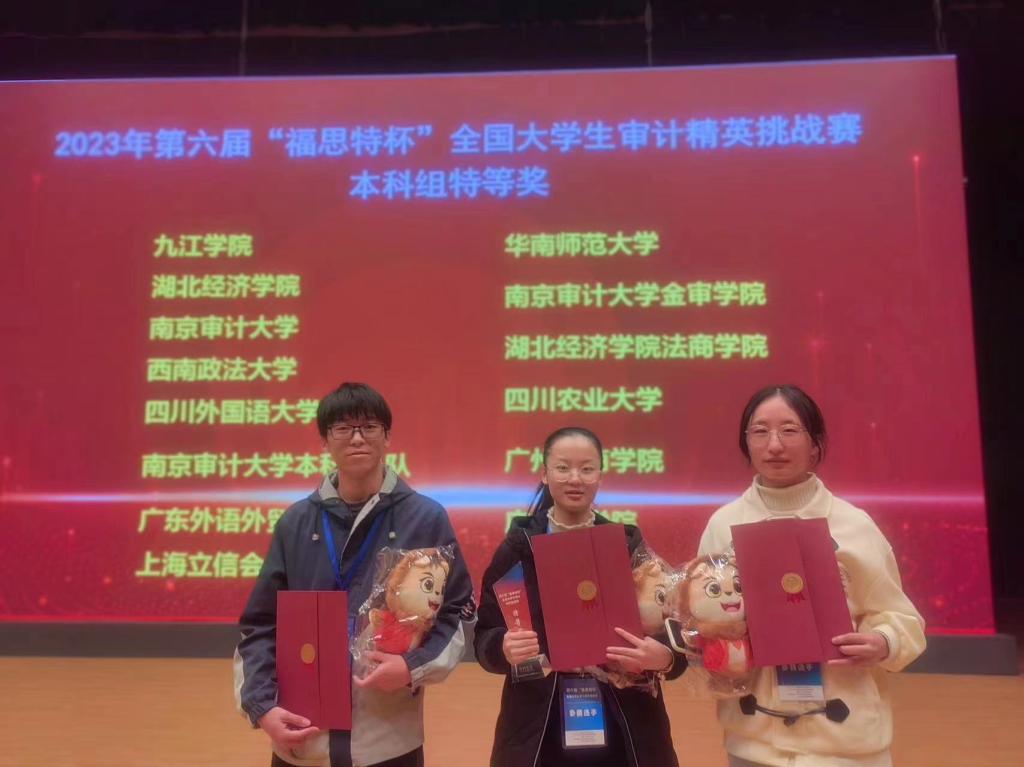 11月18日,第六届“福思特杯”全国大学生审计精英挑战赛在江苏南京审计大学圆满落幕。由我校管理学院胡淑娟和尹曦老师指导,审计学专业2021级叶艾、淦还珠、占立威三位同学组成的参赛代表队,凭借扎实的专业能力和完美的团队合作,以排名第一的总成绩荣获全国特等奖(本科组),并且在大赛的闭幕式上代表全体获奖队伍作典型发言。