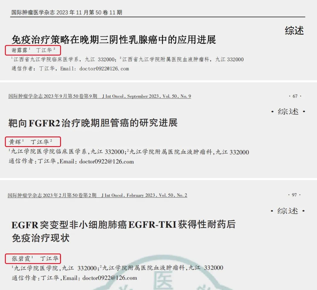 今年2月,A1911班张碧霞成功在中华医学会核心期刊《国际肿瘤学杂志》第2期发表了题为《EGFR突变型非小细胞肺癌TKI耐药后免疫治疗进展》的论文。下半年,A1911班黄辉撰写的《靶向FGFR2治疗晚期胆管癌的研究进展》论文、A1912班谢露露撰写的《免疫治疗在三阴性乳腺癌中应用进展》论文,也先后发表在该杂志的第10期和11期。三名同学目前都在外实习,他们称,“作为本科医学生,在国家级核心期刊上成功发表论文,对于我们自己,是很难得的;而同一个大班的三名学生同一年成功发表,这在九江学院附属医院也是第一次,这都要归功于丁老师的悉心指导。”