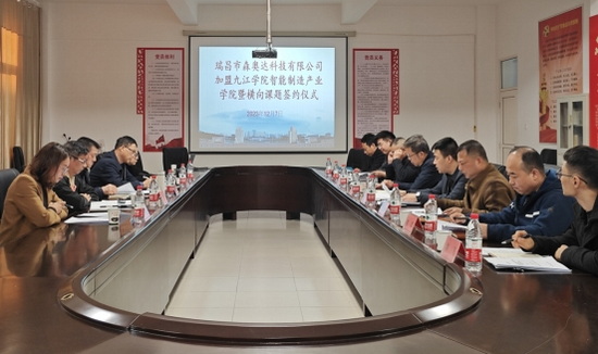 12月7日下午,瑞昌市森奥达科技有限公司加盟我校智能制造产业学院暨横向课题签约仪式在机械实验楼举行。双方将充分利用各自优势,实现资源互补,在人才培养、技术攻关、资源共享等多方面开展深入合作。副校长严平,市科技局副局长但少鸣、市科协副主席陈冬青、市工信局科技科科长鲍澄和森奥达科技有限公司总经理王贤长等,我校教务处、科研处、创新创业学院、智能制造产业学院负责人及教师代表等参加签约仪式。
