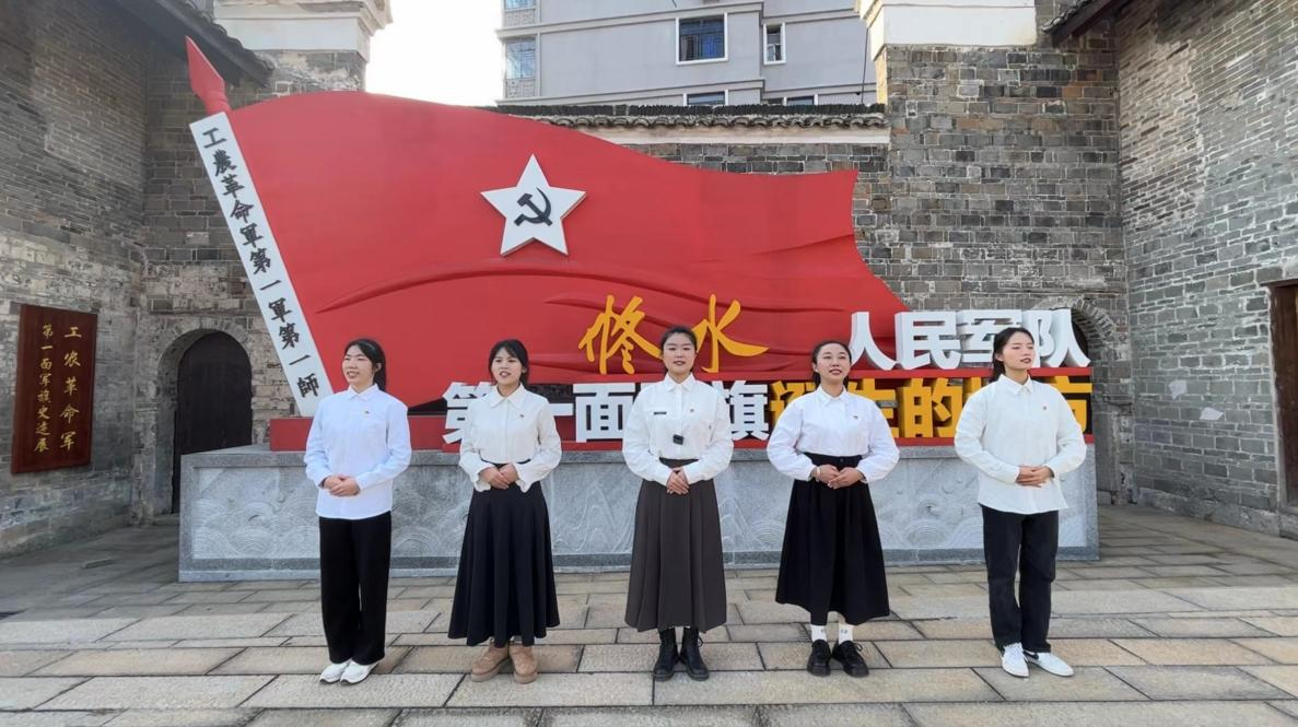 “ 军叫工农革命,旗号镰刀斧头,修铜一带不停留,便向平浏直进……” 秋收起义修水纪念馆内,九江学院管理学院学生第四党支部“ 红色走读” 研学团的青年党员,在工农革命军第一军第一师军旗巨型雕塑前深情朗诵,无限缅怀先烈伟绩。