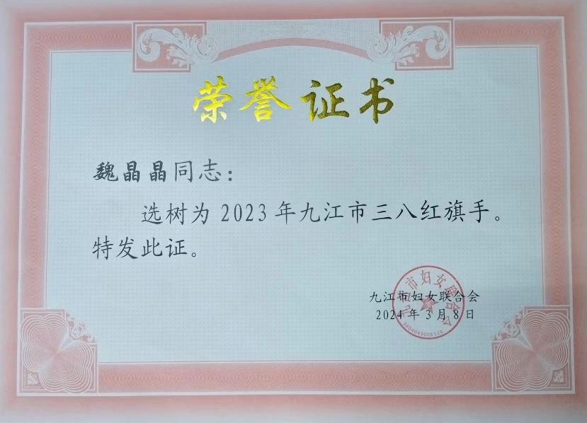 根据九江市妇女联合会下发的《关于选树2023年度九江市三八红旗手(集体)的通知》(九妇字〔2024〕1号),我校学生处魏晶晶、教育学院张亚珍两位老师获2023年度九江市三八红旗手称号,此次全市选树三八红旗手共有50名。