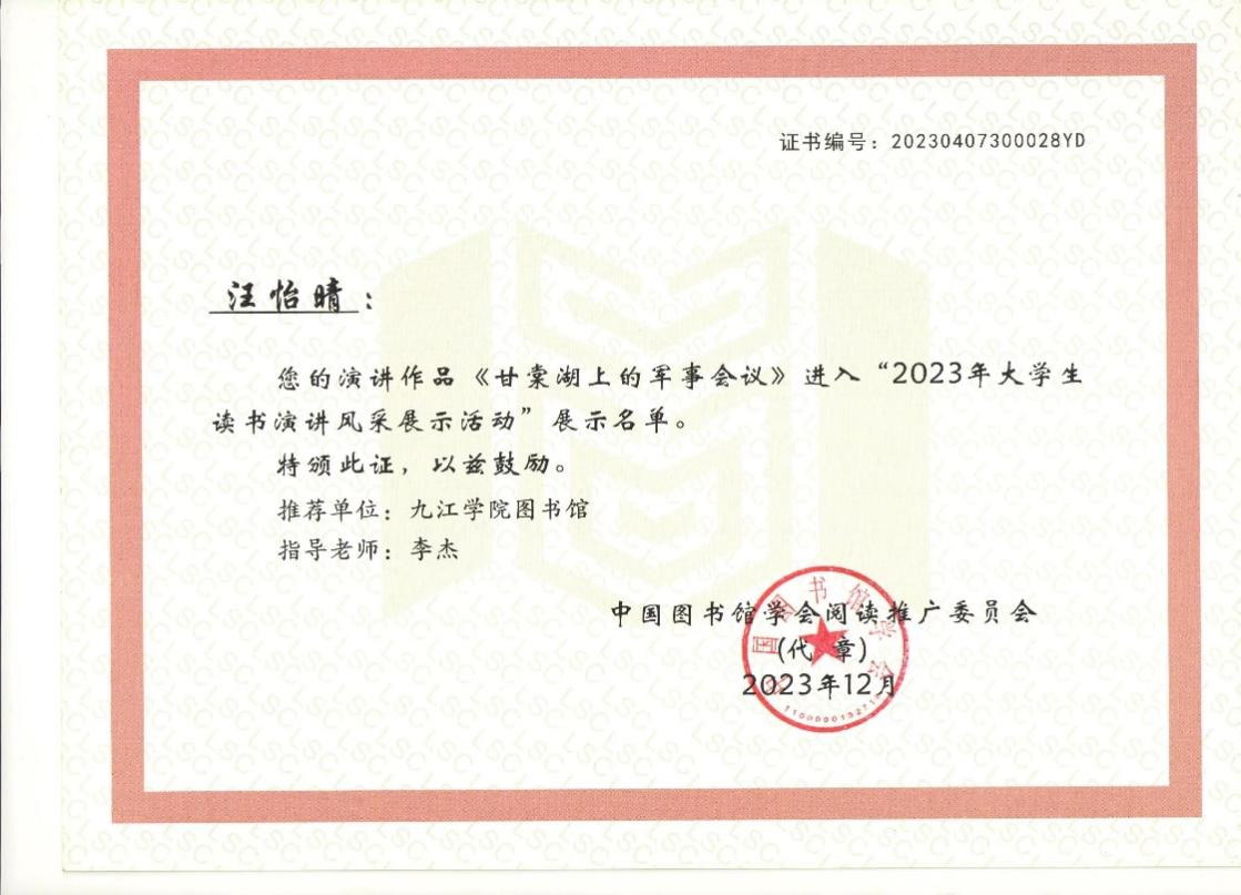 近期,中国图书馆学会公布了2023年大学生读书演讲风采展示活动评审结果。本次活动共收到全国高校推荐的作品770部,经过初审、复审、研议、确认等环节,最终评选出入展作品58部。我校学子外语A2015班汪怡晴在此次全国大学生读书演讲风采展示活动中取得佳绩,演讲作品《甘棠湖上的军事会议》(指导教师:李杰)被评为入展作品。