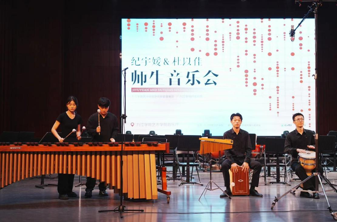 4月24日晚7时,由艺术学院主办,学院钢琴器乐教研室承办的“纪宇媛&杜以佳博士师生音乐会”在艺术学院音乐厅举行,副校长王万山、查振华,九江市文联副主席段虹、艺术学院党政领导同志和各二级学院师生,共同观看这场由打击乐团、萨克斯管重奏团共同打造,充满激情和艺术魅力的音乐盛宴。
