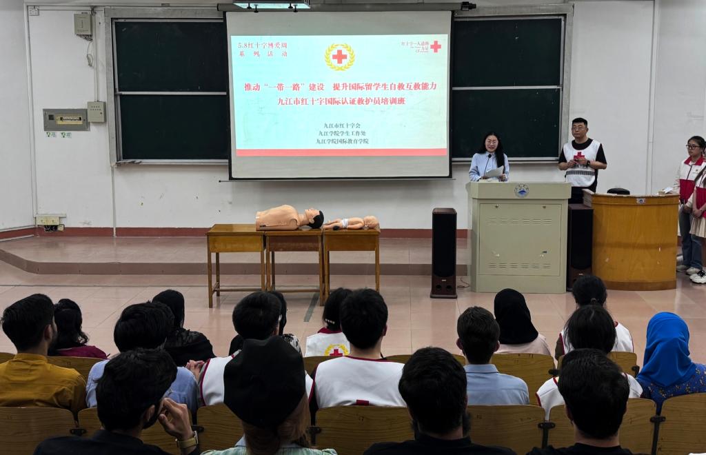 为提高我校国际留学生防灾避险和自救互救能力,在5月8日世界红十字日之际,九江市红十字会联合我校学生工作处和国际教育学院在竞知楼三号阶梯教室举行了国际认证救护员培训班开班仪式。活动培训对象为我校国际教育学院留学生和本校其他学院学生共30余人。