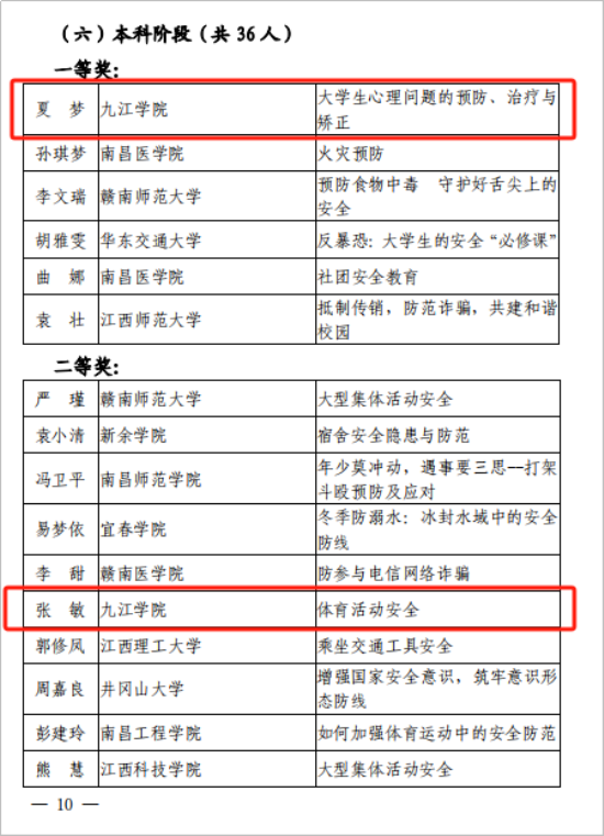 近日,省教育厅公布2023年全省大中小学公共安全教育骨干教师教学能力展示活动的比赛结果,我校保卫处(平安建设办公室)选派的教师代表建筑工程与规划学院夏梦老师的参赛作品《大学生心理问题的预防、治疗与矫正》和经济学院张敏老师的参赛作品《体育活动安全》分别获得本科教师组一等奖和二等奖。