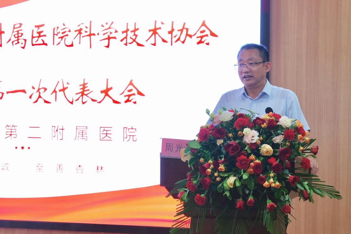 周光灿代表市科协对二附院科协的成立表示祝贺。他表示,九江学院第二附属医院科协的成立,是市基层科协发展中的一件大事,对团结医疗科技工作者,促进科技创新、推动医学事业健康快速发展起到积极的作用。希望在今后的工作中,科协要积极走出去,引进来,多与国内大医院靠大联强,与院士团队多交流合作,举办科技论坛,提升科研眼界。