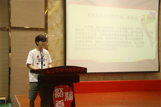 获奖学生代表医学A2116班徐伟宣和A2252班罗岚烨同学依次上台发言。他们分享了自己的学习经验和心路历程,表达了对学校和余翠林女士的感激之情,并鼓励同学们珍惜在校时光,努力学习专业知识,勇敢地面对未来的机遇和挑战。