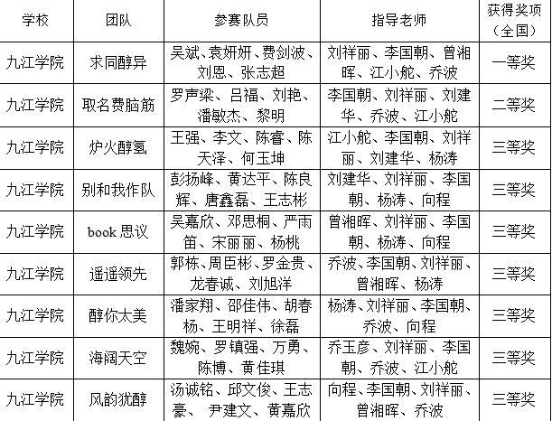 我校今年共有来自化学工程与工艺、应用化学等专业的9支队伍参赛,由我校刘祥丽、李国朝、杨涛、向程、刘建华、江小舵、曾湘晖、乔波、乔玉彦9位教师组成的教练团队精心指导,从2月底竞赛题目发布到7月底提交作品,经过5个月紧张有效的训练,指导老师和参赛队员相互配合和共同努力,9份作品全部成功提交,其中“求同醇异”团队不畏强手、顽强拼搏,在华中赛区决赛中脱颖而出,荣获赛区特等奖,并成功闯入全国总决赛,其他8份作品也全部获奖,共计获得全国一等奖1项、二等奖1项、三等奖7项。