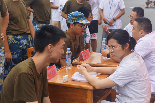 “同学,你看起来脸色有点苍白,哪里感觉不适?”医生细心地询问着一位新生,并随即拿出听诊器,为他进行初步检查。在确定只是轻微中暑后,医生为他提供了防暑药品,并耐心指导他如何正确使用,同时还叮嘱他可适当休息、多喝水。附属医院医疗队员秉承“以学生为中心”的服务理念,亲切的话语和细致的关怀,让新生感受到来自学校的温情厚爱。医疗队员们提供专业医疗服务的同时,还特别关注学生的心理健康,耐心沟通并引导新生学会缓解因身体不适带来的焦虑,鼓励大家积极参与军训,磨练品格意志,用实际行动诠释了“守护健康,责任至上”的医者精神。
