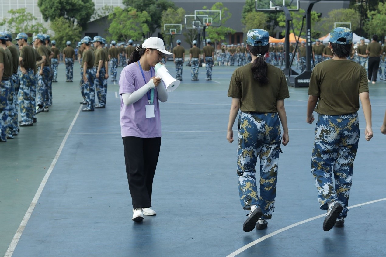 “眼要睁,口要闭,抬头挺胸,目视前方”“身体不舒服及时打报告”。除了新生,还有一群人活跃在军训场上,他们穿着统一,动作标准,带着工作牌,一丝不苟地讲解动作要领,每一次指导都精准到位,使新生们在训练中不断规范动作。