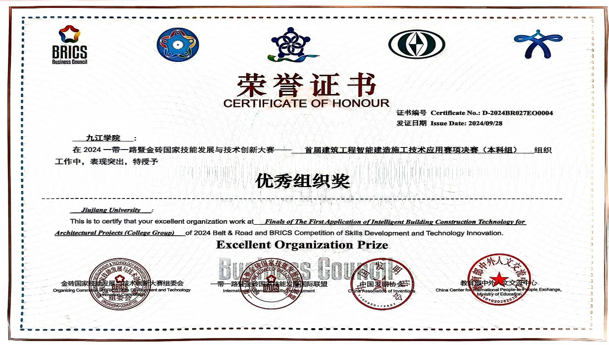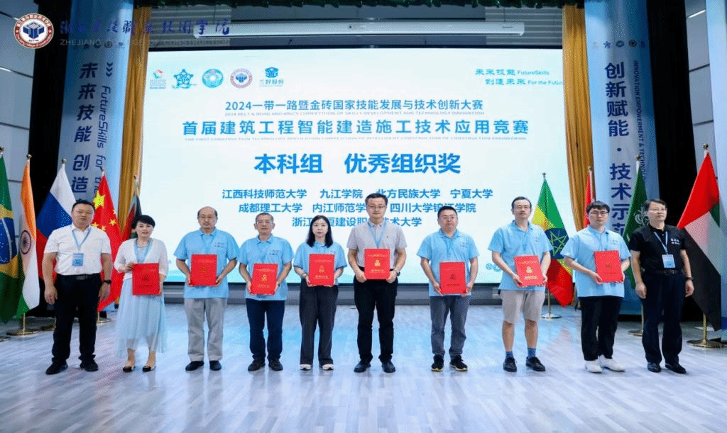近日,2024一带一路暨金砖国家技能发展与技术创新大赛首届建筑工程智能建造施工技术应用赛项全国总决赛在杭州圆满落幕。本届智能建造赛项决赛经过前期覆盖全国600余所高校的校园赛及区域选拔赛,最终415支队伍入围总决赛。我校建工学院张丽凡,袁神明两位同学参加此次比赛,经过激烈比拼,最终荣获本科组二等奖;我校获得“优秀组织奖”,指导教师张静、刘洪佳获“优秀指导教师”荣誉称号。