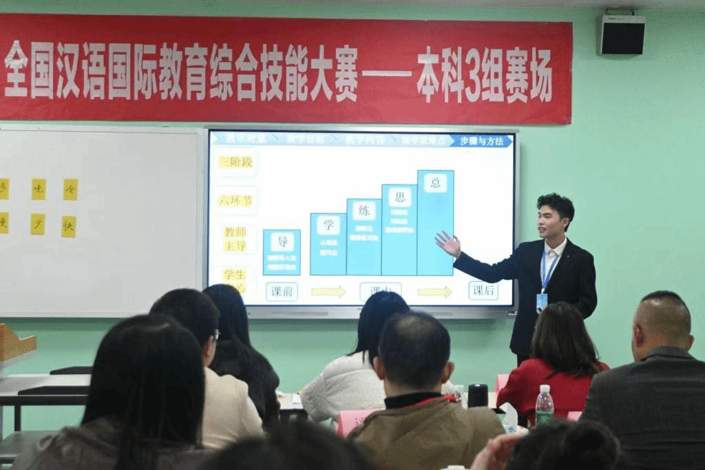 “中学西渐杯”是面向全国汉语国际教育专业大学生的高水平赛事,涵盖在线直播教学、汉语国际教育专业理论考核、教学风采展示等内容,旨在通过比赛锤炼学生的综合能力。比赛分为初赛和决赛,内容包括教学选题、教案撰写、课件制作,以及现场教学展示、中英文问答和中华文化短视频展示。无论是知识深度还是能力广度,这项赛事对选手提出了极高的挑战,更考验团队的默契与协作。