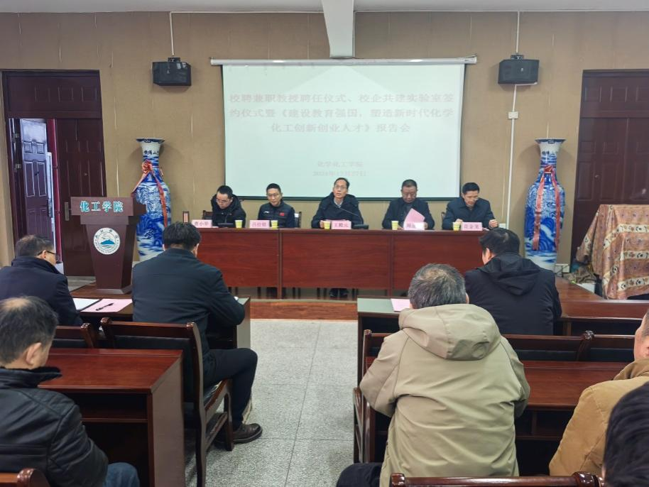 为进一步落实“3353”战略,助力学校应用型发展,12月27日,化学化工学院举行校企联合实验室签约揭牌暨第八期“赤心报国·绿色化工”报告会。江苏世名科技股份有限公司创始人、名誉董事长吕仕铭被聘为九江学院兼职教授,并为学院师生作题为“建设教育强国,塑造新时代化学化工创新创业人才”的专题报告。校党委委员、副校长王殿元出席会议并致辞。世名科技子公司江西固夏能源科技有限公司总经理周金龙、化学化工学院师生代表参加会议。