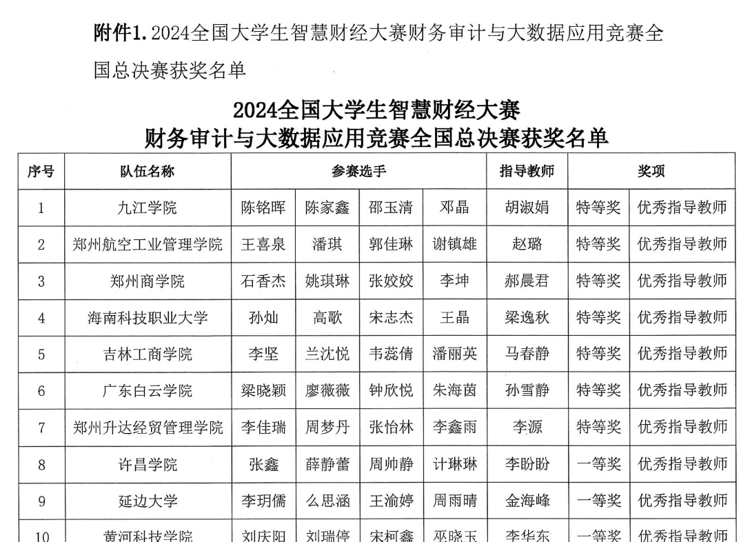 12月19日,由中国商业会计学会主办的2024年全国大学生智慧财经大赛财务审计与大数据应用赛项全国总决赛传来捷报。我校陈家鑫、陈铭晖、邵玉清、邓晶四位同学组成的代表队,以全国第一名的优异成绩荣获特等奖,为我校再添一枚重量级奖项。
