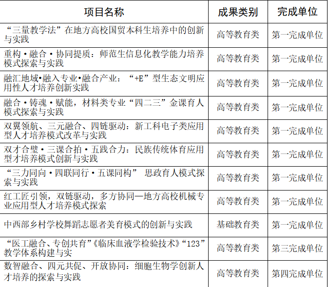 12月31日,江西省教育厅《关于公布2024年江西省教学成果奖青年培育项目评选结果的通知》(赣教科字〔2024〕12号)发布,我校共有11项省教学成果奖青年培育项目获批立项。其中,以第一完成单位获得高等教育类8项,基础教育类1项;以第三完成单位获得高等教育类1项,以第四完成单位获得高等教育类1项。具体名单如下: