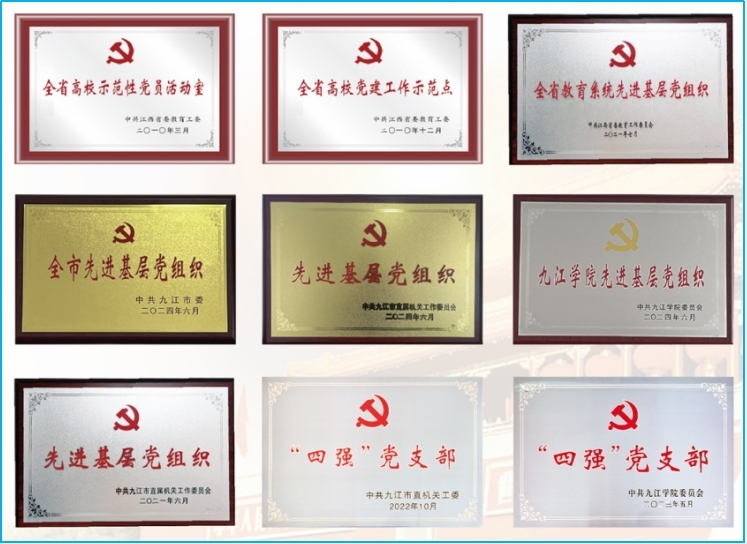 学院党委对标高校党建建设要求,全面推进党建工作系统化、项目化和特色化,成效明显。先后被江西省委教育工委授予“全省高校党建工作示范点”“全省高校示范性党员活动室”;连续13年荣获学校“先进基层党委”称号、2022年获批学校“党建工作标杆学院”、2023年获批江西省首批“全省党建工作标杆院系”,2024年荣获九江市“先进基层党组织”、九江市直机关单位“先进基层党组织”、九江学院“先进基层党组织”称号。
