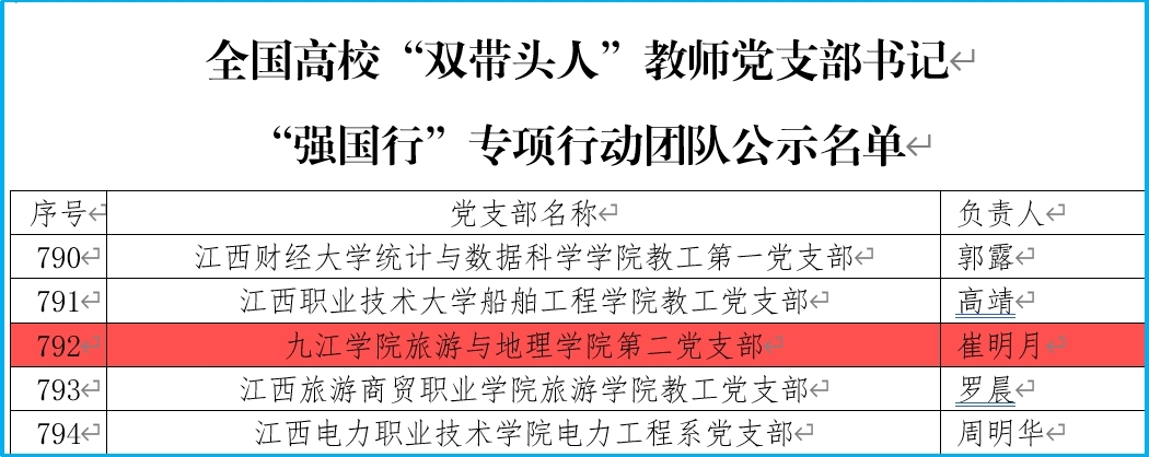 教工第二党支部2021年荣获全省教育系统“先进基层党组织”和九江市直机关工委“先进基层党组织”称号;2022年荣获九江市直单位“四强”党支部称号、九江学院“四强”党支部称号;2023年获批江西省首批“全省党建工作样板支部”;2024年获批第四批“全国党建工作样板支部”培育创建单位、全国高校“双带头人”教师党支部书记“强国行”专项行动团队、九江学院“先进基层党组织”称号。