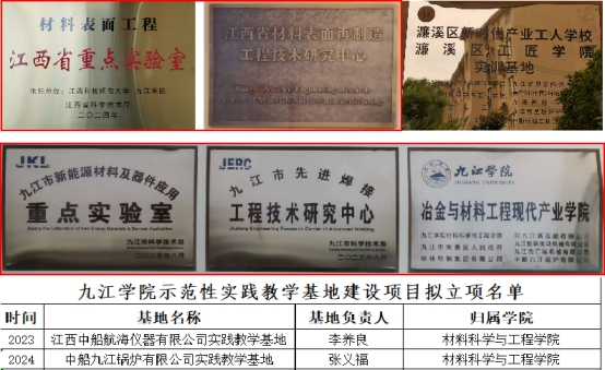材料科学与工程学院精准对接赣北地区典型的冶金与材料工程单体和下游产品生产企业,2023年攻克九江市“揭榜挂帅”项目《激光&激光-MIG复合焊接在船用高强度有色金属焊接中的应用技术开发》;2023年攻克九江市“揭榜挂帅”项目《激光&激光-MIG复合焊接在船用高强度有色金属焊接中的应用技术开发》。与奥盛(九江)新材料有限公司合作项目《大跨径斜拉桥斜拉索制造关键技术研究与应用》获江西省科学技术进步二等奖,《一种预应力镀锌钢丝接头稳定化处理生产方法》《一种镀锌钢丝再加工工艺》均获江西省技术发明三等奖。