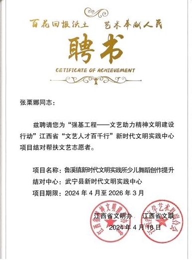 张栗娜被聘为“新农村少儿舞蹈美育工程”(江西武宁)定点学校项目负责人