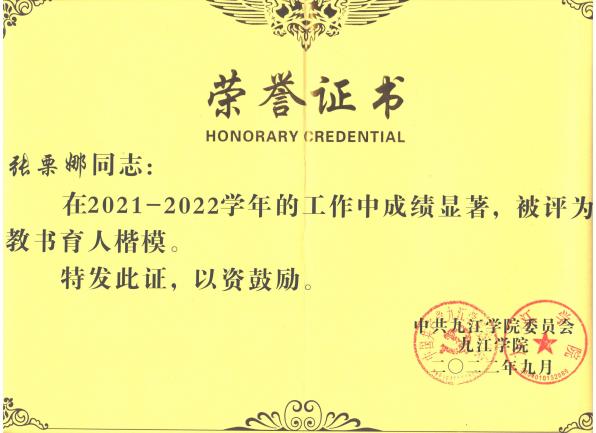 团队教师分别荣获中国舞蹈家协会“优秀志愿者”、中国舞蹈家协会“顶尖教师”、全国素质教育先进工作者、江西省“赣鄱俊才”青年文化领军人才、江西省“文艺人才百千行”优秀志愿者、九江学院“教书育人楷模”“优秀班主任”“优秀教师”等荣誉称号;入选中国舞蹈美育家大辞典、聘为江西省委宣传部“四个100”文化导师、聘为九江市基础教育美育专家顾问;九江市基础教育(舞蹈)授课专家;获批九江市“张栗娜名家工作室”项目资助;入选九江学院“百人计划”等。
