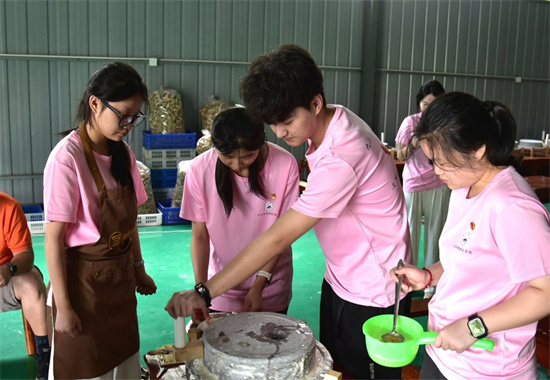 6月26日,实践队走进流芳乡开启非遗传承实践活动。上午,队员们运用各类豆类原料进行豆画拼接创作,将经济学院院徽、美好愿景等元素融入作品,感受民间智慧与传统技艺的创新融合。下午,队员们走进当地非遗工坊,亲身体验豆腐制作全过程,从挑选黄豆到石磨磨浆再到柴火灶煮浆点卤、压制成型,在豆香四溢中领悟古法技艺的匠心传承,探索非遗文化赋能乡村振兴的新路径。