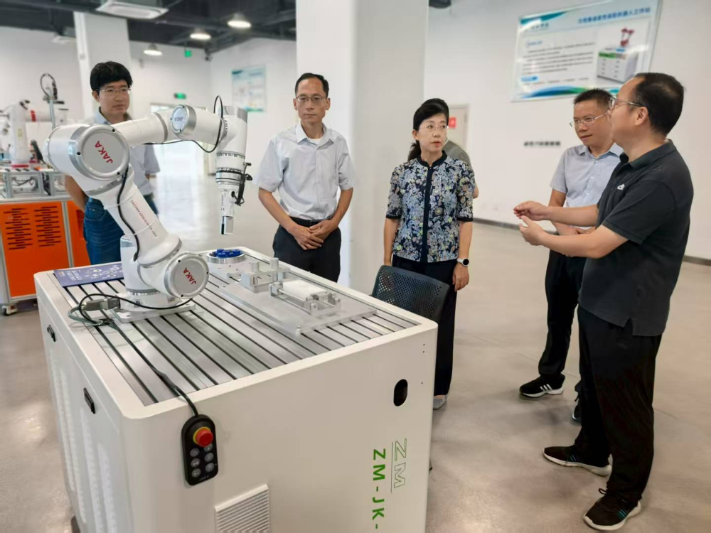 在智能制造实验(实训)中心,徐志鸿一行参观了集智能化、网络化、虚拟化、平台化、数字化于一体的、以智能制造技术典型应用示范、智能制造技术“实”域(设备层)、智能制造技术“虚”域(信息层)等为主的实习实训室和实验室。