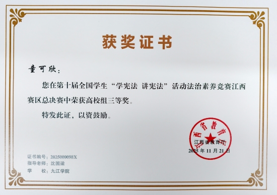 近日,江西省教育厅主办的第十届全国学生“学宪法 讲宪法”活动江西赛区总决赛圆满落幕。九江学院代表队在赛事中脱颖而出,法学院学生童可欣、占紫娴在法治素养竞赛和演讲比赛中分别斩获高校组三等奖,以双奖佳绩彰显新时代青年法治素养。